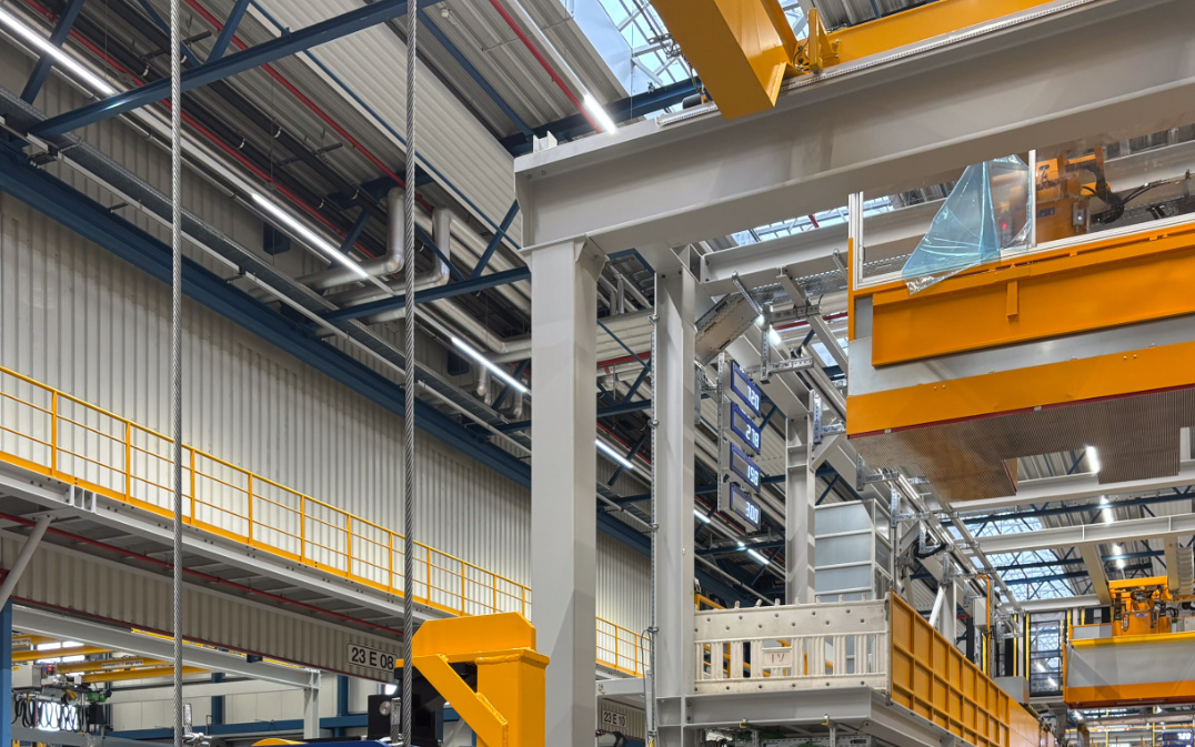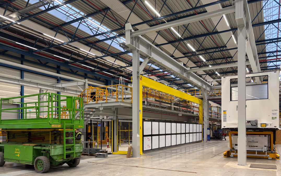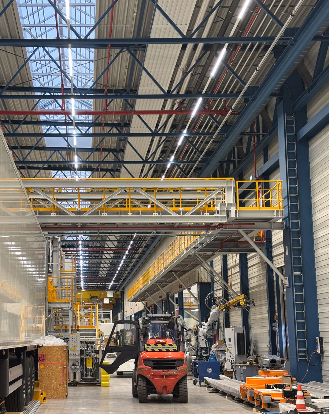 In der ca. 4.500m² großen Halle werden Sattelauflieger montiert. Besonders interessant sind die Dachträger, welche den 30m weiten Innenraum überspannen.