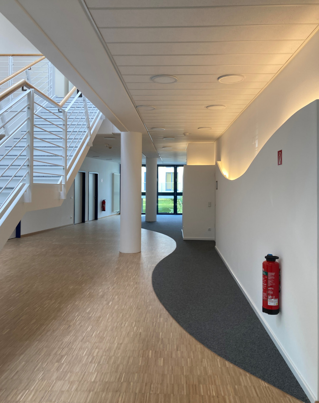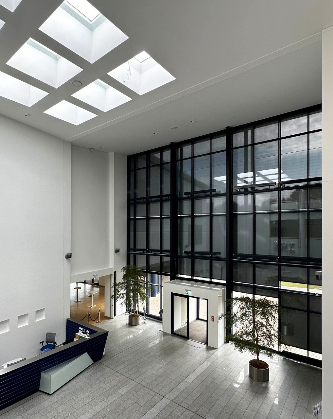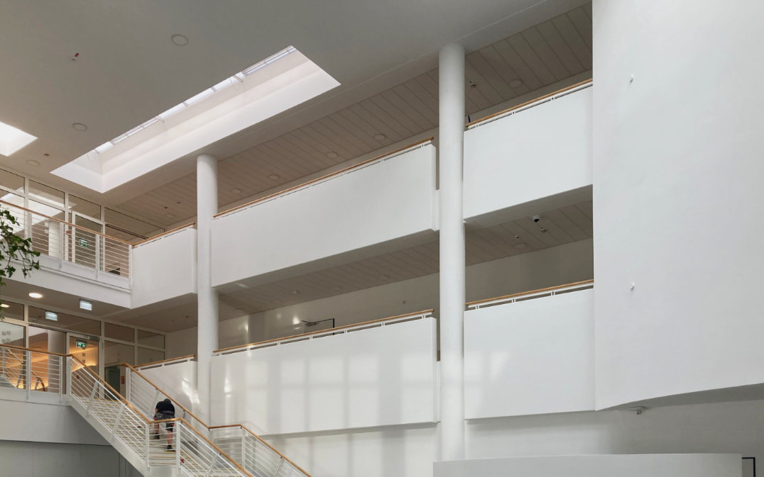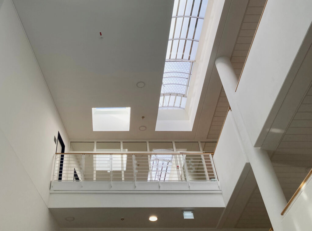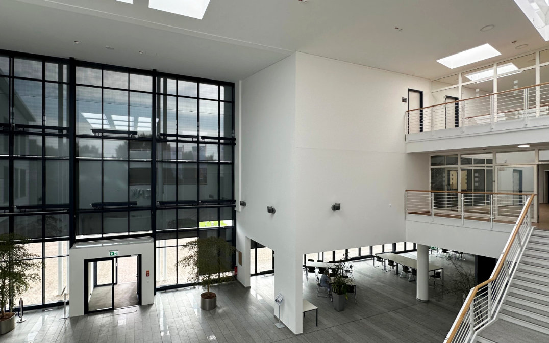 Seit 2023 arbeiten wir an der Sanierung des Schulungszentrum für die IHK. Im Atrium, welches den Eingangsbereich überspannt wurden ein neues Lichtband und Lichtkuppeln eingebaut. Des weiteren waren teilweise die Fußböden abgenutzt und wurden ausgebessert. Verfärbte Deckenbereiche wurden angestrichen und überarbeitet. Im nächsten Schritt sollen das Dach sowie die Lüftungsanlage energetisch saniert werden.