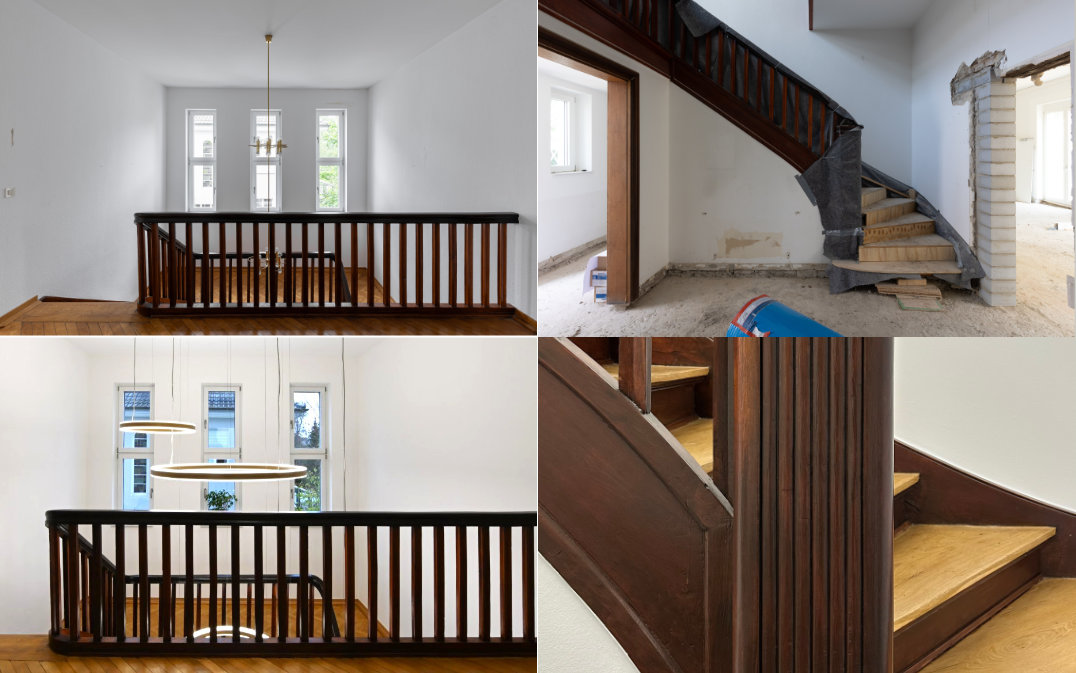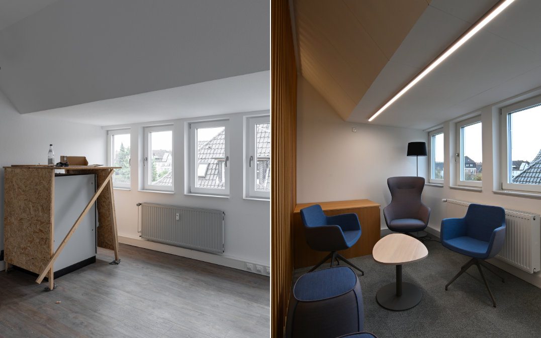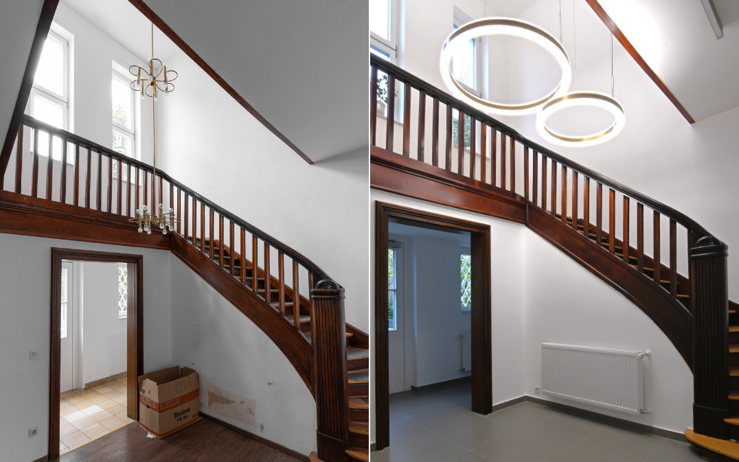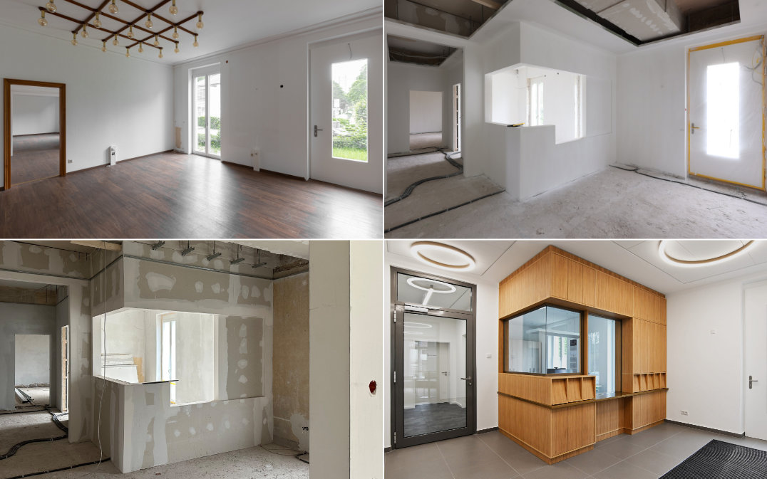 Energetische Dachsanierung, Fassadensanierung mit Austausch der Fenster, Neuorganisation der Erschließung, barrierefreie Gestaltung der Außenanlagen in Abstimmung mit der Denkmalpflege sowie komplette Neuorganisation der Innenräume.
